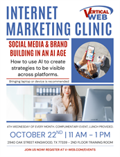 Vertical Web's Internet Marketing Clinic helps businesses up their marketing game through various digital marketing strategies. Ensure your website's success and increase your traffic and leads through our monthly clinics. Held every fourth Wednesday of the month from 11 to 1 pm at 2940 Oak Street, Second Floor Training Room. This is a complimentary clinic, lunch is provided, and parking is free. This month's topic is Social Media and Brand Building in an AI Age. Register here --> https://www.verticalweb.com/event/social-media-and-brand-building-in-an-ai-age